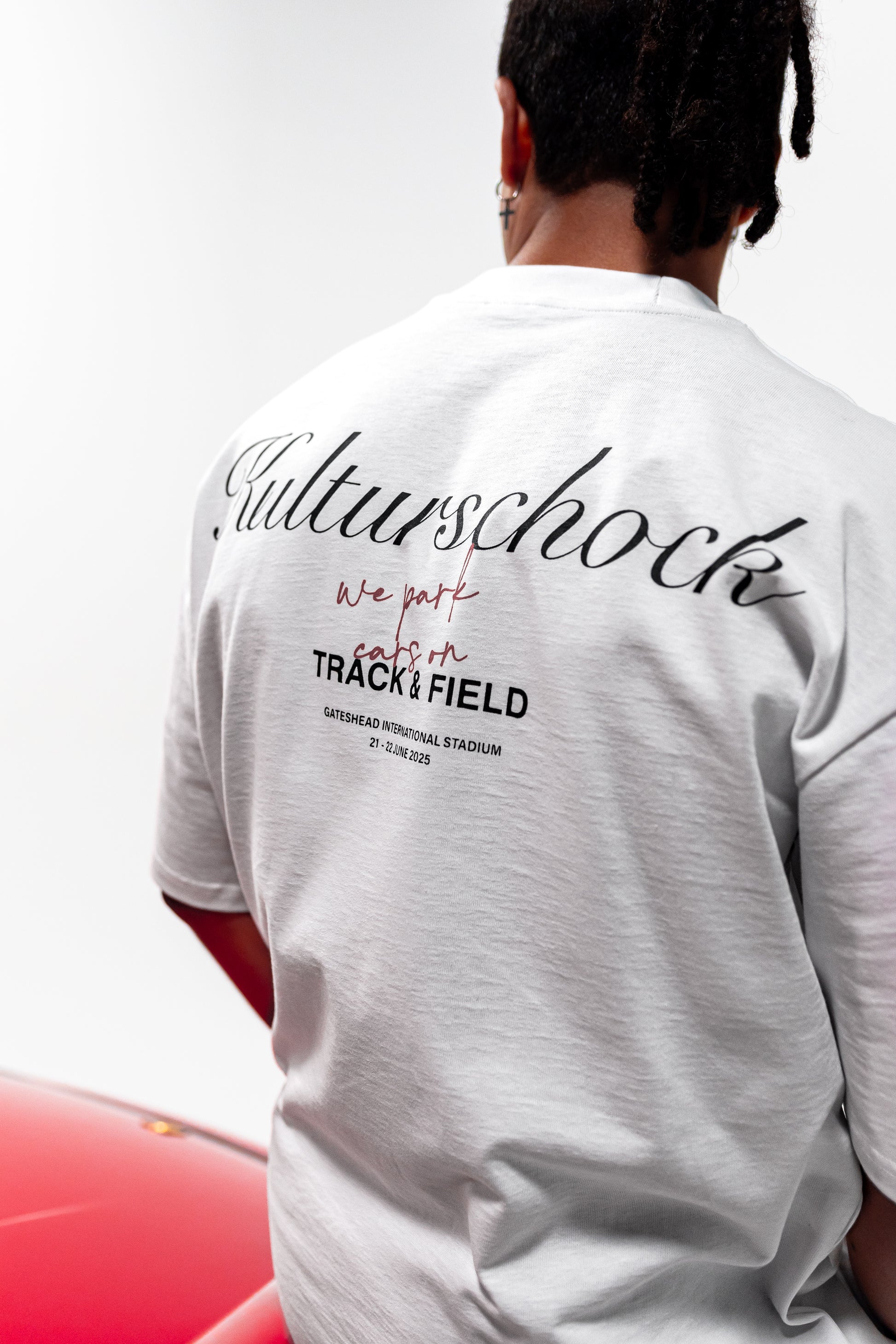 A nod to Gateshead’s Olympic legacy — reimagined through the kulturschock lens. This pure white tee features our tongue-in-cheek Track & Field print on both front and back, blending athletic nostalgia with irreverent design. A limited-edition release for Kulturschock Car Show 2025, this tee is exclusive to the event — a wearable keepsake for those who were there.