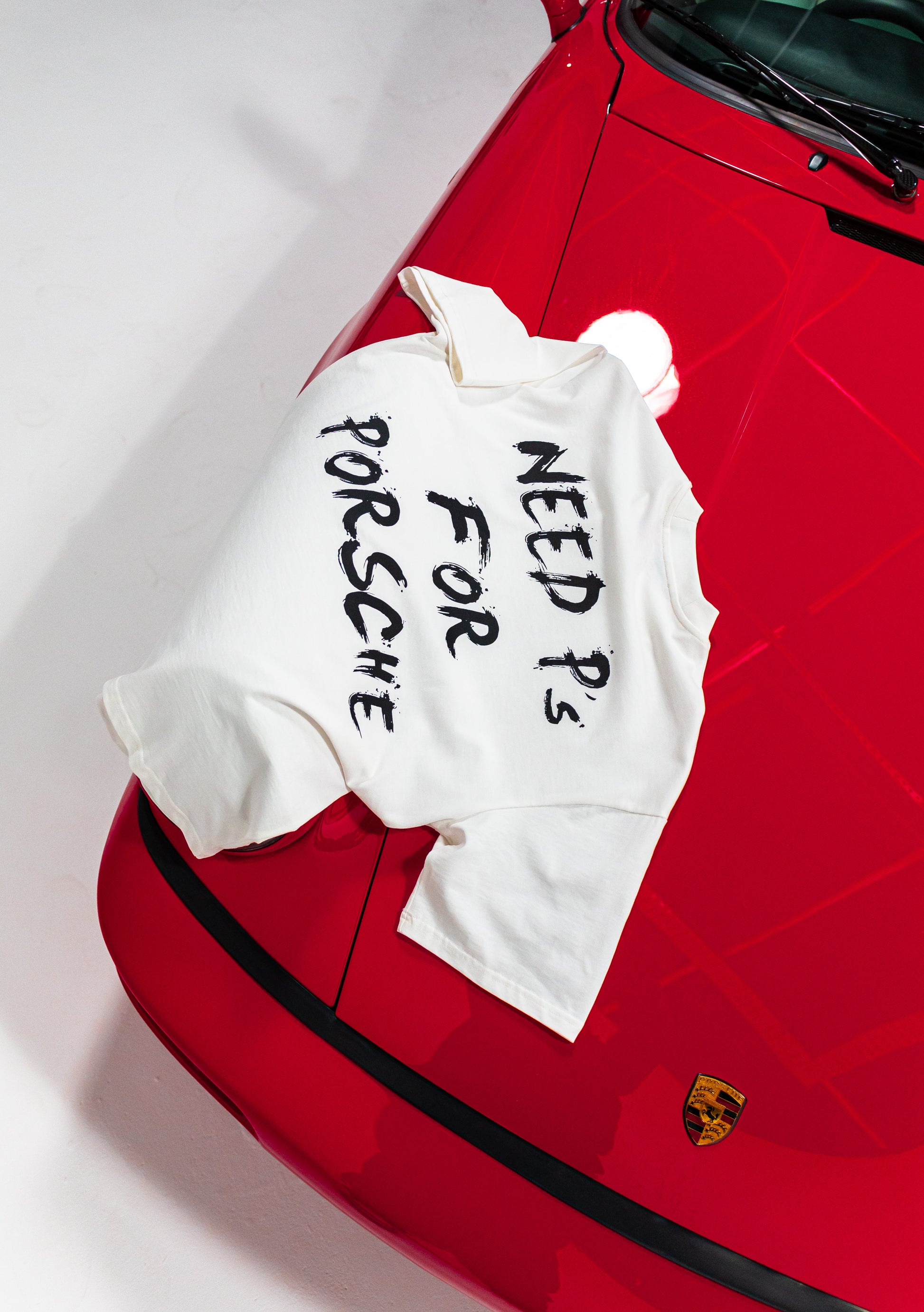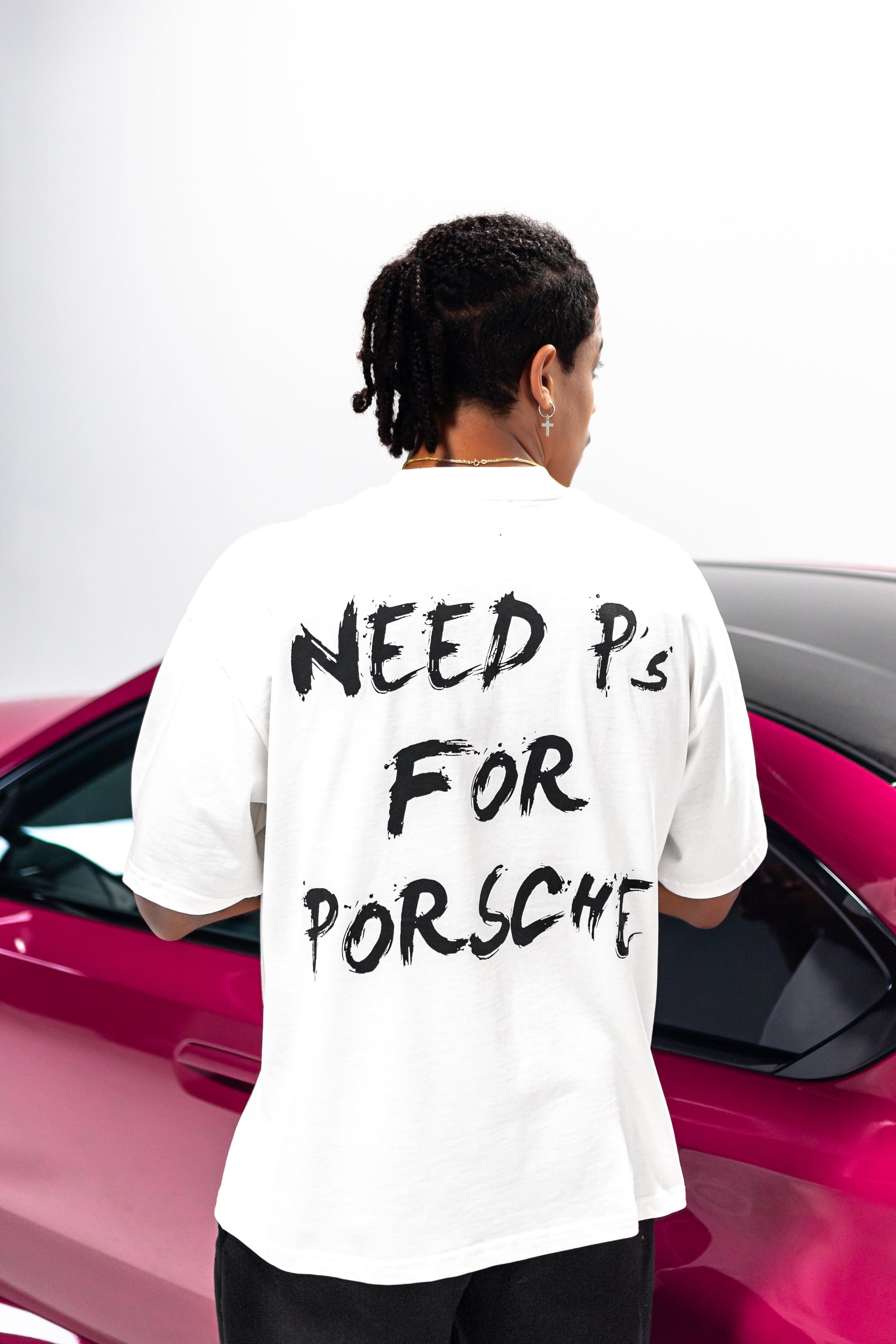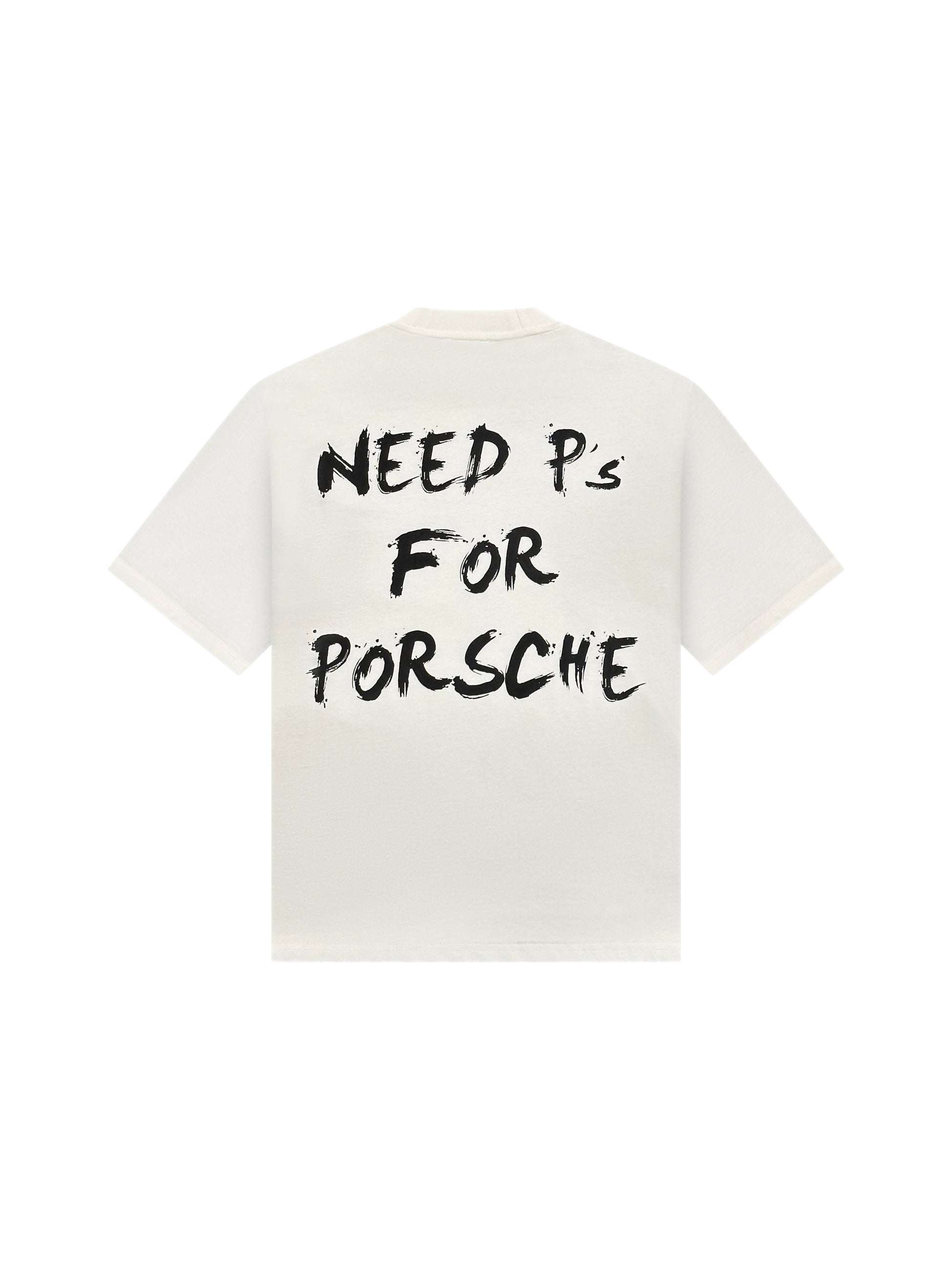 Crafted from 100% premium cotton, this unisex, boxy-fit tee offers a soft, breathable feel designed for everyday wear. The off-white base is punctuated by a silkscreen "kulturschock" logo placed subtly at the left mid torso, while the back features a bold statement print reading "Need P's for Porsche." A clean silhouette with just the right amount of edge.