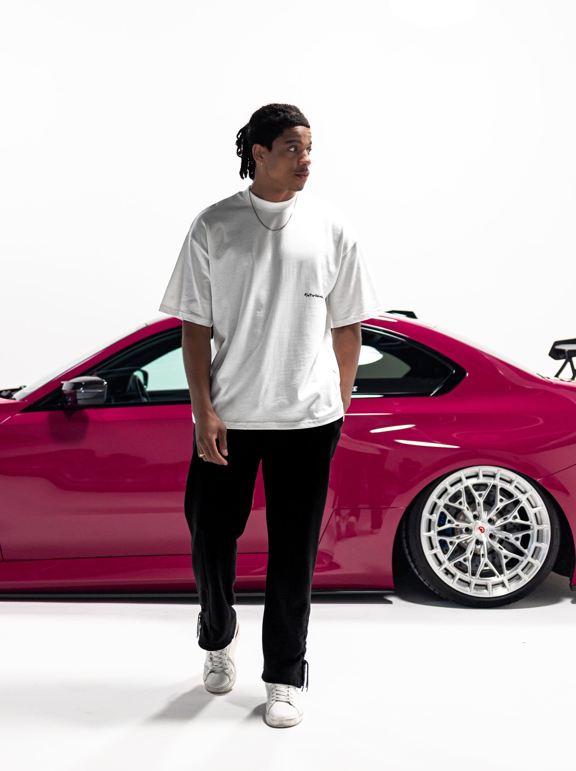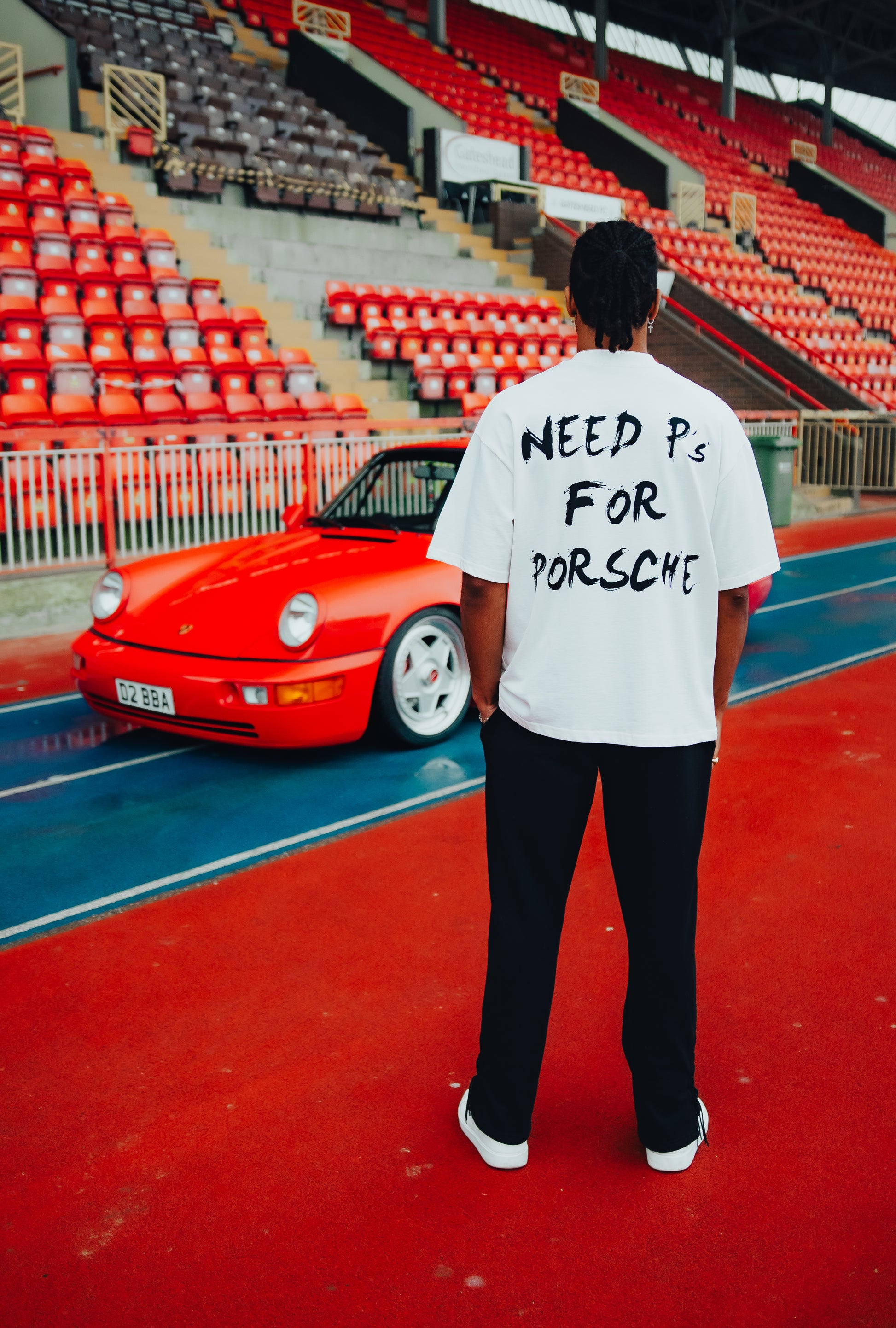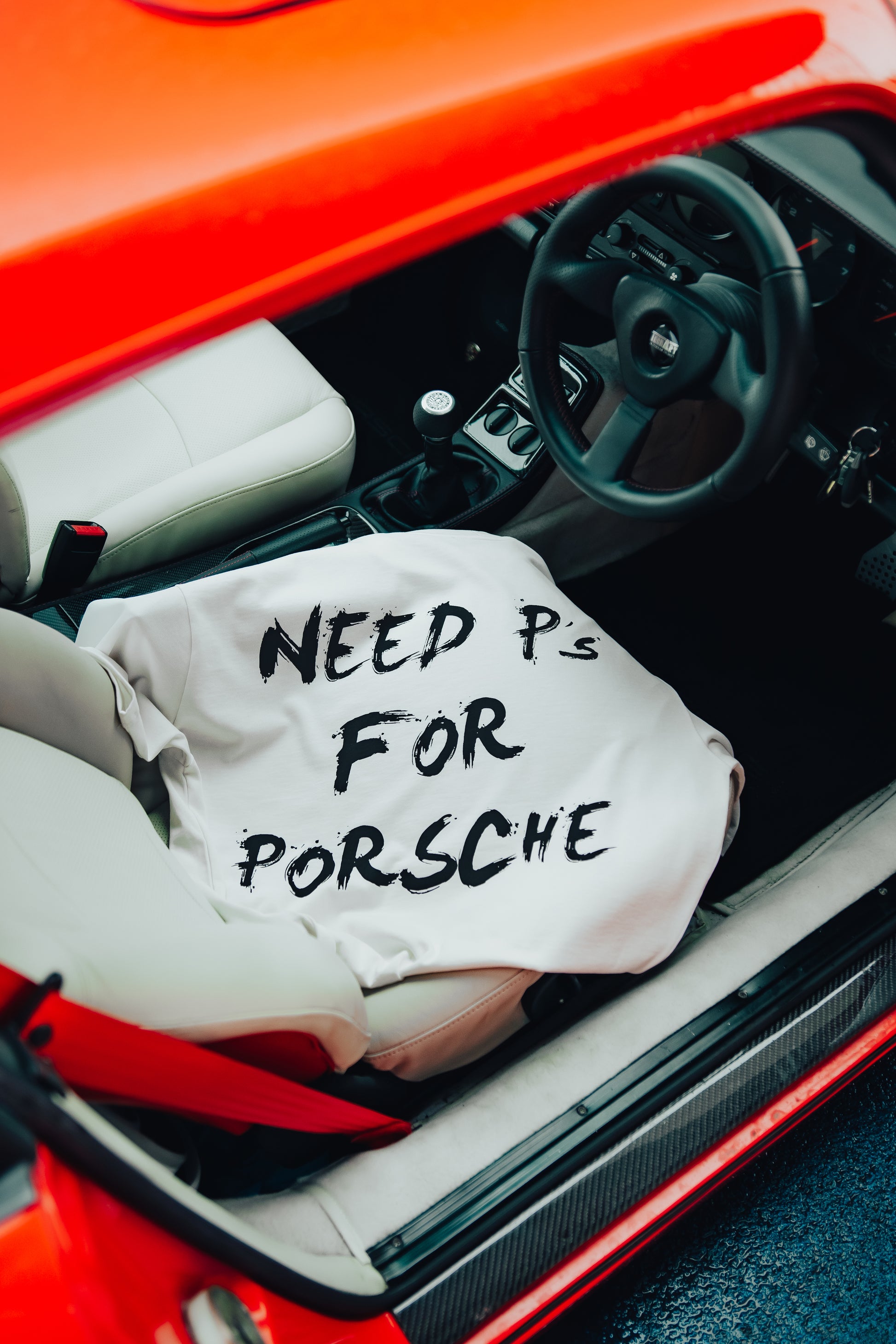 Crafted from 100% premium cotton, this unisex, boxy-fit tee offers a soft, breathable feel designed for everyday wear. The off-white base is punctuated by a silkscreen "kulturschock" logo placed subtly at the left mid torso, while the back features a bold statement print reading "Need P's for Porsche." A clean silhouette with just the right amount of edge.